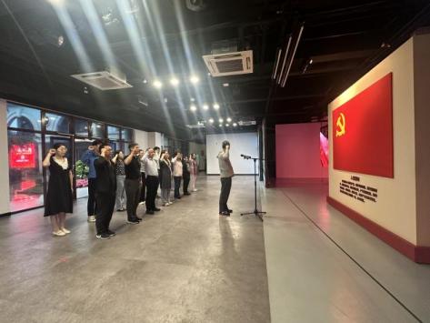 步入展馆,党员们来到宣誓区,重温入党誓词。党支部书记陈中华担任领誓人,带领全体党员面向党旗庄严宣誓。80个字的入党誓词铿锵有力,掷地有声,是所有党员矢志不渝的初心使命,不断前行的力量源泉。