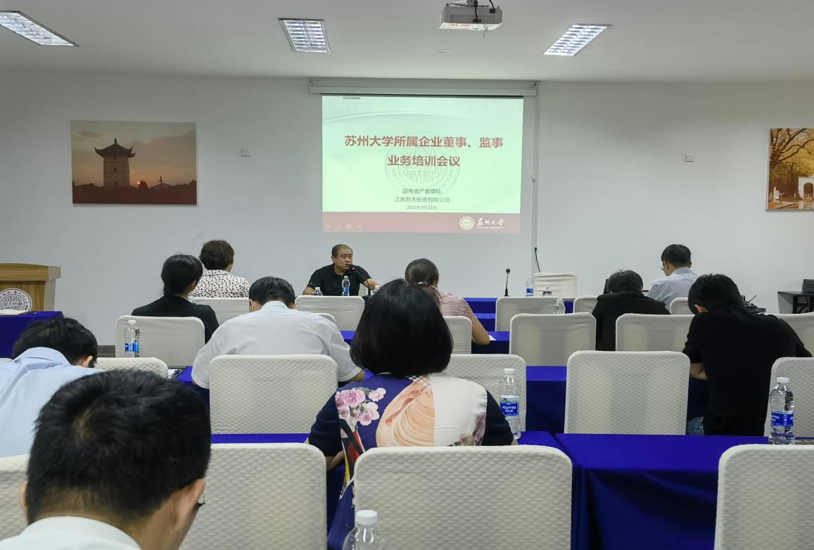 9月22日下午,苏州大学2022年度所属企业董、监事业务培训会在东吴饭店大礼堂一楼培训室召开,本次培训会由国有资产管理处和江苏苏大投资有限公司联合举办。会议由仇国阳董事长主持,特邀国有资产管理处处长陈中华,中准会计师事务所江苏分所合伙人注册会计师马亚红,上海市锦天城(苏州)律师事务所高级合伙人王义勇,苏州大学和苏大投资公司所属企业委派董事、监事等20多人参加了培训。